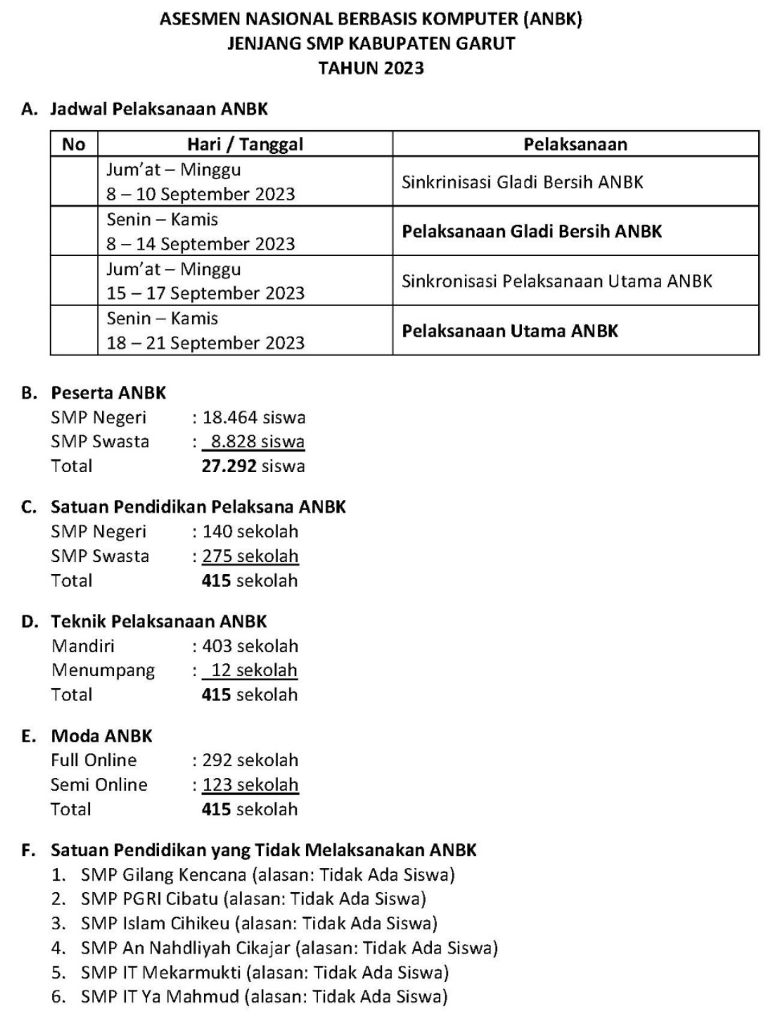 Pada tahun ini tercatat 27.292 siswa SMP Kabupaten Garut sudah siap melaksanakan ANBK dengan moda full online atau semi online. Mereka berasal dari 415 SMP yang terdiri atas 140 SMP Negeri dan 275 SMP Swasta. Tahapannya meliputi simulasi, sinkronisasi gladi bersih, dan pelaksanaan. Sesuai jadwal yang dibuat Kemendikbud, pelaksanaan ANBK Utama pada tanggal 18 s.d. 21 September 2023.