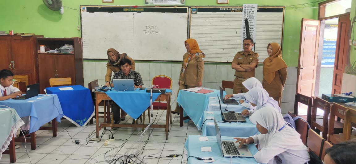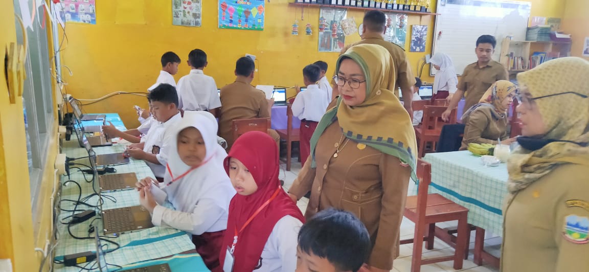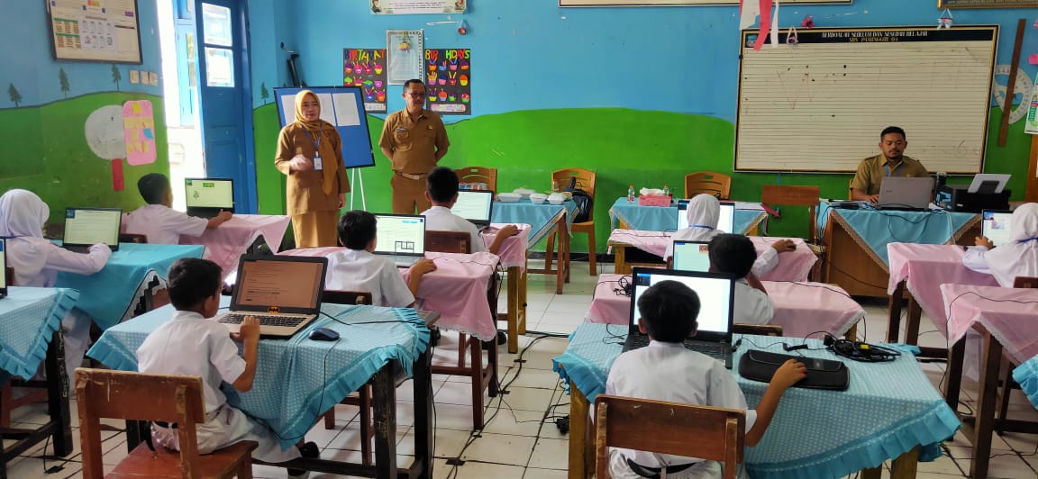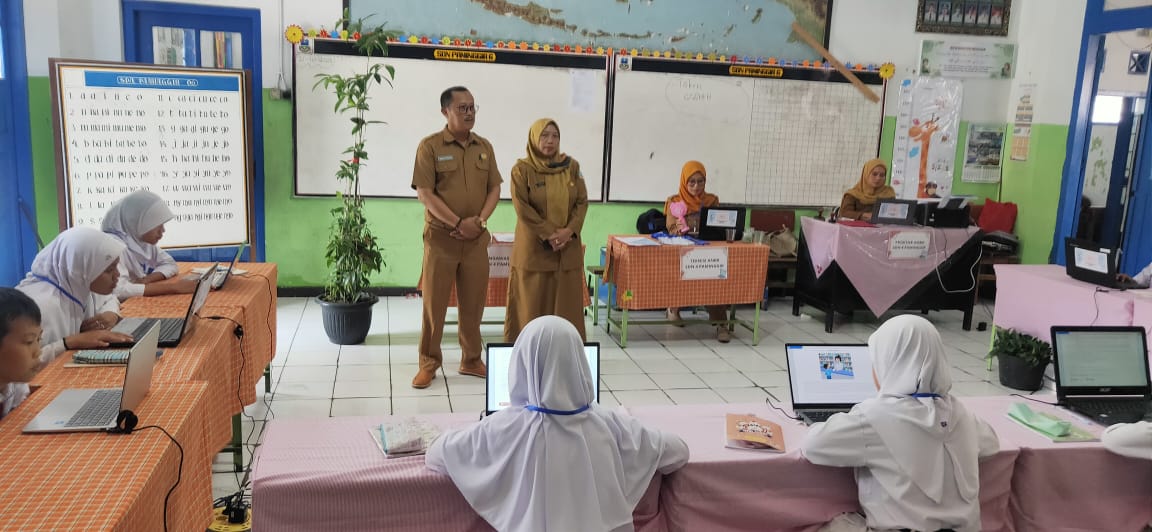 Wawan Sopyan, S.Pd., M.Pd., pengawas pembina bersama Siti Rohamah, S.Pd., M.M., Kepala SDN 5 Paminggir, memonitor pelaksanaan ANBK.
