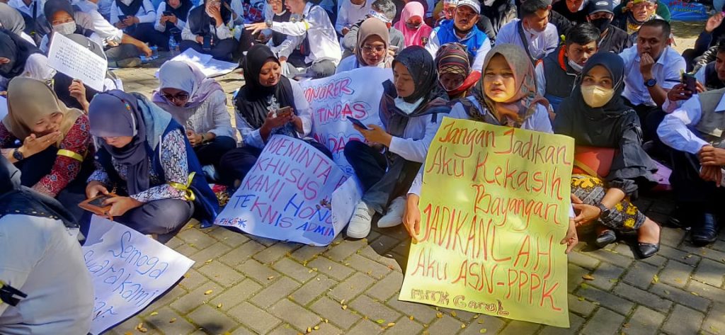 TARKID, (Kandahar.id).- Merasa kurang diperhatikan, sejumlah honorer tenaga teknis administrasi yang tergabung dalam Forum Honorer Tenaga Kependidikan (FHTK) dan gabungan honorer lintas instansi atau Forum Honorer Kabupaten Garut (FHKG), melakukan aksi audensi ke DPRD Kabupaten Garut di Jl. Patriot No.2, Kelurahan Sukagalih, Kecamatan Tarogong Kidul, Kabupaten Garut, Jawa Barat, Kamis (7/7/2022).