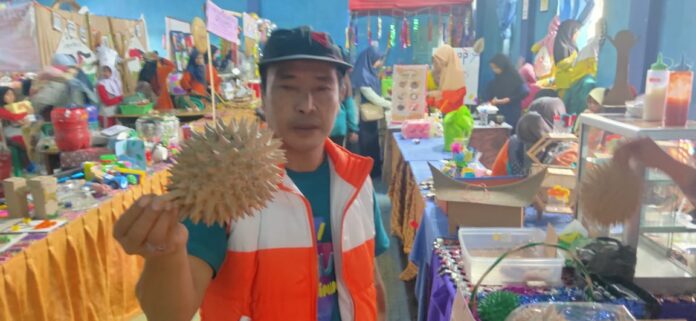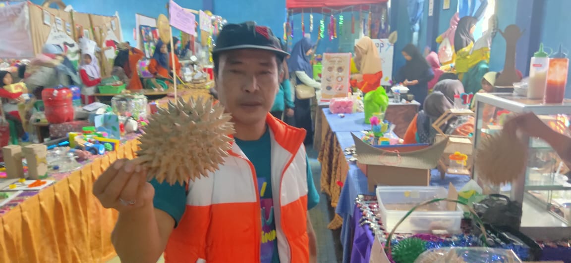 Kusnadi, S.Pd., Korwil Bidang Pendidikan Kecamatan Sucinaraja memperlihatkan buah durian karya siswa SDN 5 Tegalpanjang yang terbuat dari bahan tempurung dan kertas bekas semen, Kamis (23/11/2023).