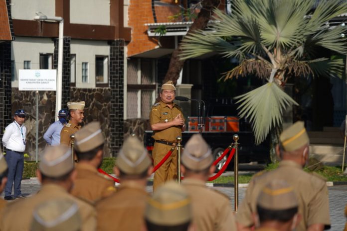 TARKID, (teraskandaga.com).- Bupati Garut, Rudy Gunawan mengambil sumpah tiga pejabat Dinas Pendidikan pada apel gabungan terbatas di Lapangan Sekretariat Daerah (Setda), Jalan Pembangunan, Kecamatan Tarogong Kidul, Kabupaten Garut, (11/7/2022).