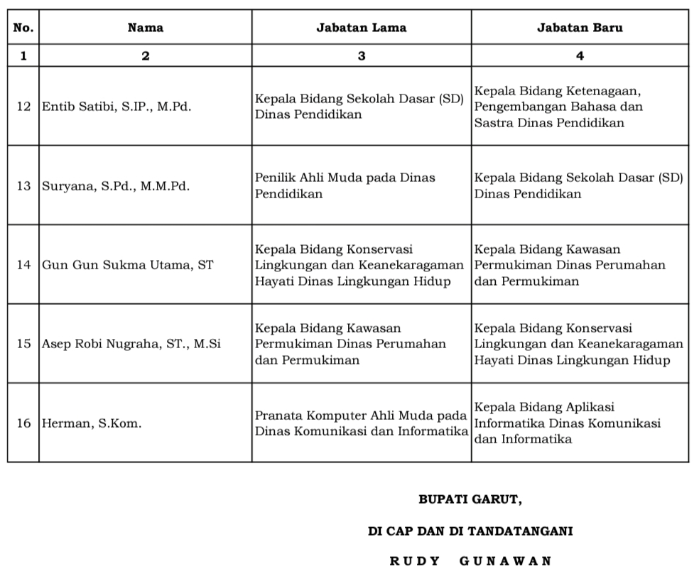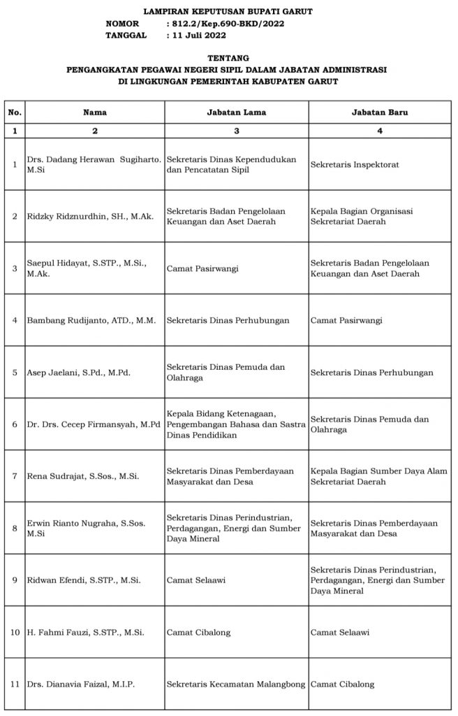 Selain ketiga pejabat tersebut, turut dilantik 13 pejabat lainnya, atas dasar Keputusan Bupati Garut Nomor : 812.2/Kep.690-BKD/2022 tentang Pengangkatan Pegawai Negeri Sipil Dalam Jabatan Administrasi di Lingkungan Pemerintah Kabupaten Garut.