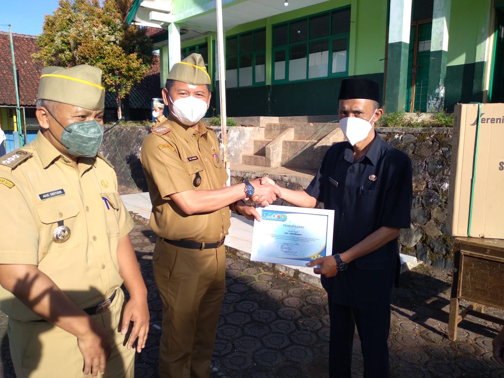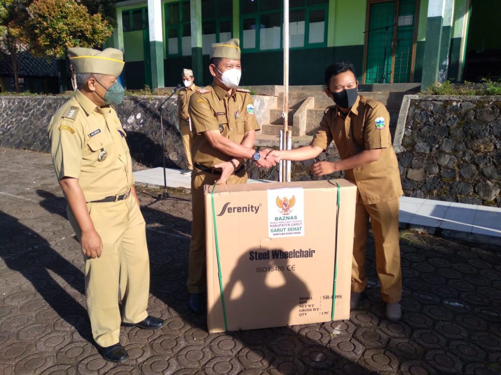 teraskandaga.com – Selain membacakan sambutan Bupati Garut pada apel gabungan ASN dan Kepala Desa di Kecamatan Mekarmukti Kab. Garut, Kepala Dinas Pendidikan Kab. Garut Ade Manadin, S.Pd, M.Pd yang bertugas menjadi Pembina Apel juga menyerahkan Bantuan dari Baznas Garut berupa Kursi Roda, Alat Bantu Pendengaran dan Stimulan Modal Usaha Guru Honorer.