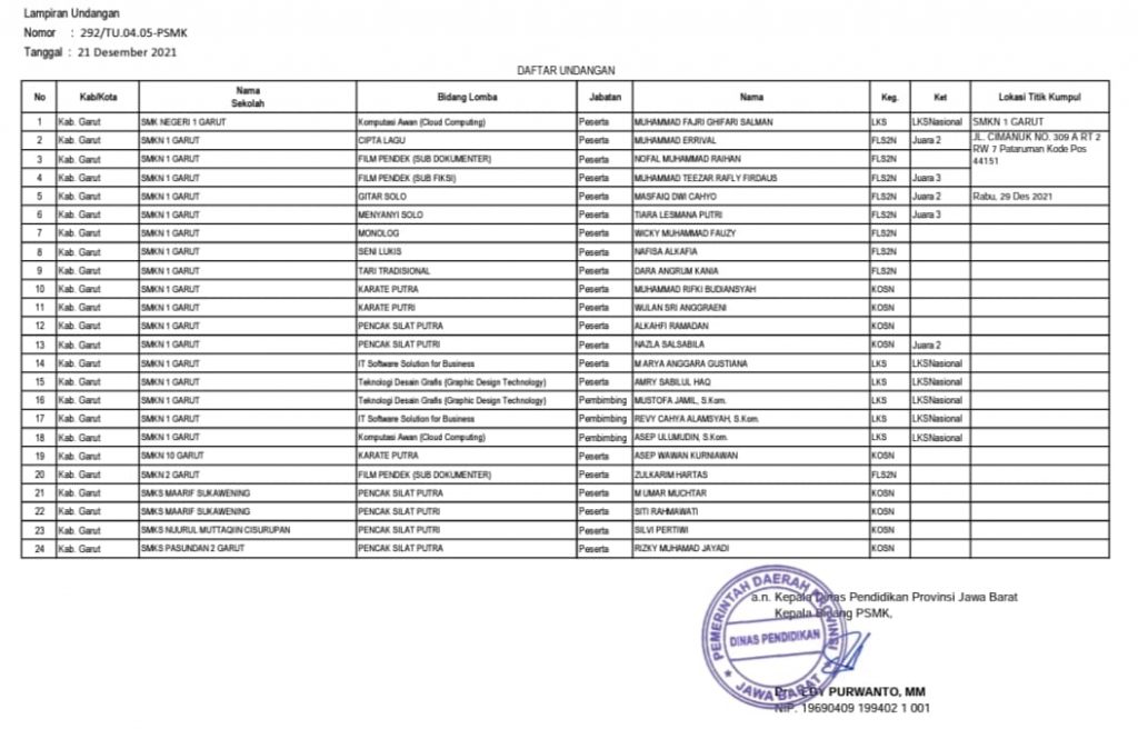 Terbukti dalam penyerahan apresiasi dan penyelesaian administrasi bagi peserta FLS2N, KOSN tingkat Provinsi Jawa Barat, peserta dan pembimbing LKS tingkat Nasional tahun 2021 yang dilaksanakan di Aula SMKN 1 Garut, Jl. Cimanuk No. 309A, Kelurahan Sukagalih, Kecamatan Tarogong Kidul, Rabu (29/12/2021).