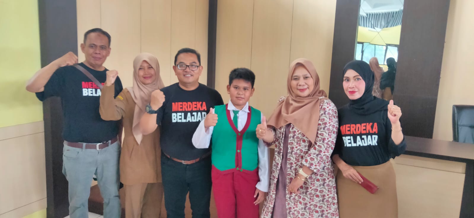 Fathur Rahman Sidiq Abdulloh siswa SD Muhammadiyah 2 (Ngarang Carita Pondok) foto bersama Een Sumarni, S.Pd.,kepala sekolah beserta guru pembimbingnya, Korwas dan pengawas.