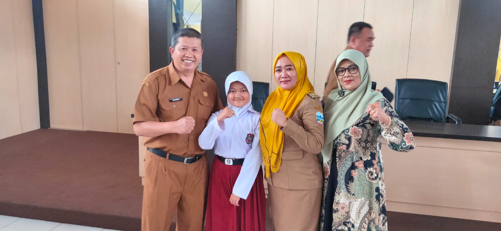 Khanza Nufus Sabiha , SDN 1 Balewangi – Cisurupan, (Biantara Putri) foto bersama Dhina Amalia Fitria, SE., Kasi Kelembagaan dan Kesiswaan Bidang SD., dan Kurnaedi, M.Pd., Korwil Bidang Pendidikan Kecamatan serta guru pembimbingnya.