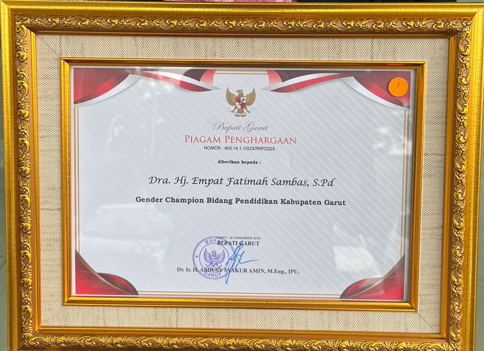 GARUT – Pemerintah Kabupaten Garut memberikan penghargaan kepada Dra. Hj. Empat Fatimah Sambas, S.Pd. sebagai Gender Champion Bidang Pendidikan Kabupaten Garut atas dedikasi dan kontribusinya yang luar biasa dalam penguatan peran perempuan di bidang pendidikan.
