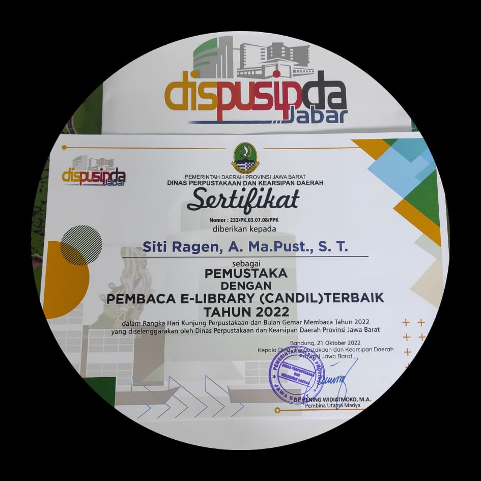 GEMAR Membaca dan Mengulik Teknologi Informasi, mengantarkan Siti Ragen, A.Ma.Pust., S.T., S.S.I., meraih penghargaan dari Dinas Perpustakaan dan Kearsipan Daerah Provinsi Jawa Barat, Jum’at, 21 Oktober 2022 di Graha Pustaloka, sebagai, “Pembaca e-Library (Candil) terbaik tahun 2022”.