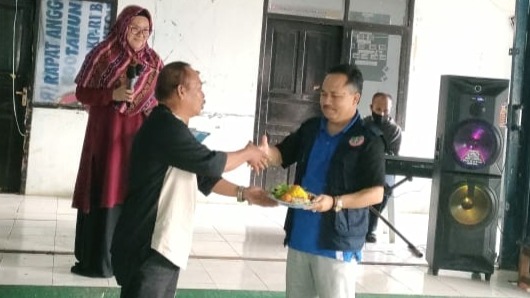 Korwil Bidang Pendidikan Kecamatan Sukaresmi, Naryana, menyerahkan tumpeng sebagai ungkapan terima kasih kepada Ketua PGRI, H Entis Sutisna M.Pd, nenandai dimulainya kejuaraan bulu tangkis GURU CUP 2023