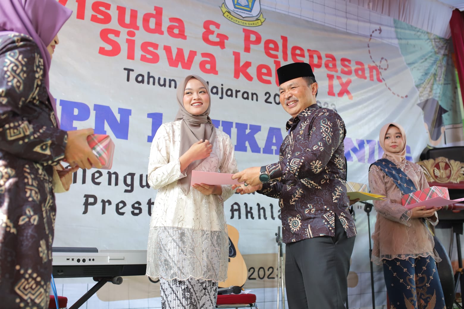 SUKAWENING, (teraskandaga.com).- Mengukir masa depan dengan prestasi dan akhlak yang mulia, jadi harapan SMPN 1 Sukawening kepada siswa kelas IX tahun ajaran 2022/2023 yang dilepas di lingkungan sekolahnya di Jl. Lapang Trikarya, Sukamukti, Kecamatan Sukawening, Kabupaten Garut Provinsi Jawa Barat, Senin (19/6/2023).
