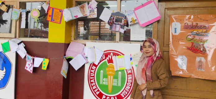 Wina Nuraeni Ahsani, S.Pd., Guru Kelas 6 menunjukkan ucapan dari siswa di HUT PGRI ke-78 dan HGN ke-29 di salah satunya di depan kelas.