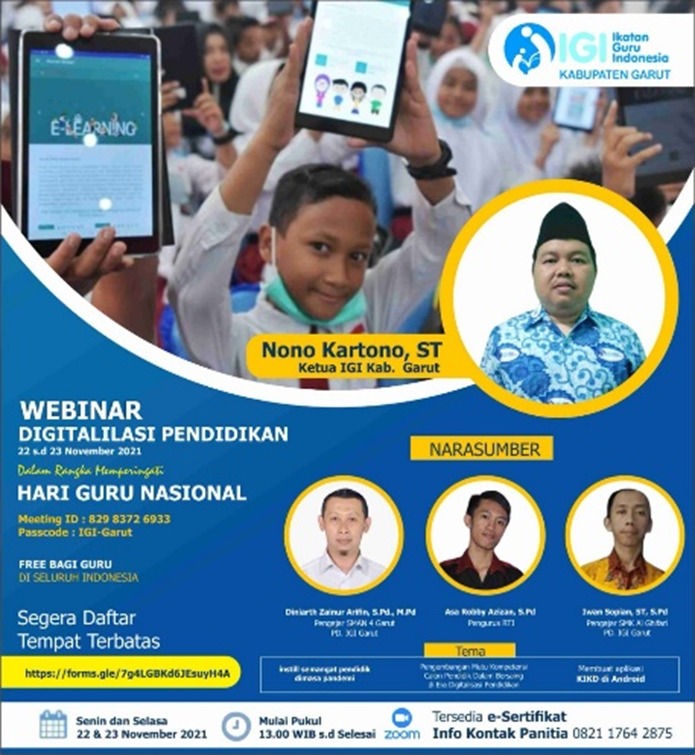 Dikutip dari gtkdikdas.kemdikbud.go.id, tema yang diusung pada Hari Guru Nasional tahun 2021 adalah “Bergerak dengan Hati, Pulihkan Pendidikan.” Maka dengan IGI Garut telah menyelenggarakan Webinar Digitalisasi Pendidikan Pra HGN pada tanggal 22-23 November 2021. Kegiatan ini memberikan angin segar bagi Insan pendidikan di Indonesia, khususnya di Kabupaten Garut, khususnya dan umumnya Insan Pendidikan di Indonesia, mengingat kondisi di tengah pandemi Covid 19 ini menjadi tantangan bagi Para Guru dan siswa untuk mengoptimalkan pembelajaran secara daring dengan memanfaatkan aplikasi digital dalam menunjang pendidikan.