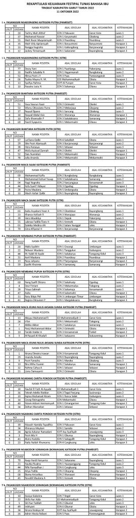 GARKOT, (teraskandaga.com).- Dinas Pendidikan Kabupaten Garut telah sukses melakukan seleksi Festival Tunas Bahasa Ibu (FTBI) jenjang SD, masing-masing juara pertama dari tujuh mata lomba yaitu Sajak Sunda, Aksara Sunda, Pupuh, Carpon, Biantara, Dongeng dan Borangan. Mereka akan mengikuti FTBI tingkat Provinsi Jawa Barat yang rencananya akan dilaksanakan di Pangandaran tanggal 30 November 2022, dan pembukaannya tanggal 29 November 2022.