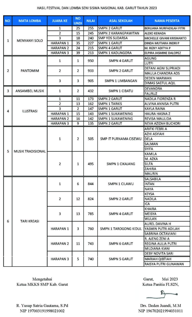Untuk selengkapnya, berikut daftar juara FLS2N jenjang SMP tingkat Kabupaten Garut 2023, dan hanya juara 1, 2 saja yang akan mewakili Kabupaten Garut di tingkat Provinsi Jawa Barat.