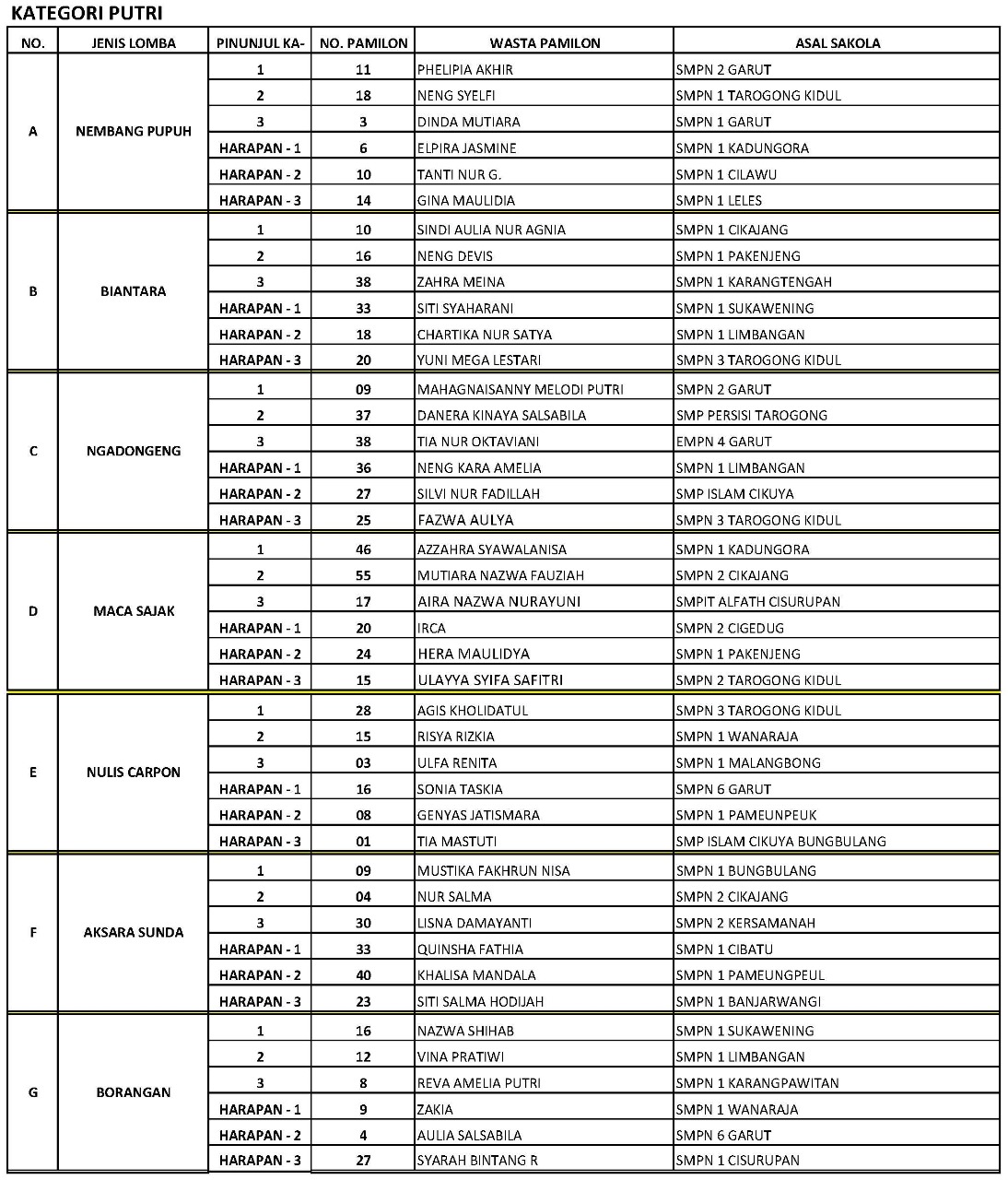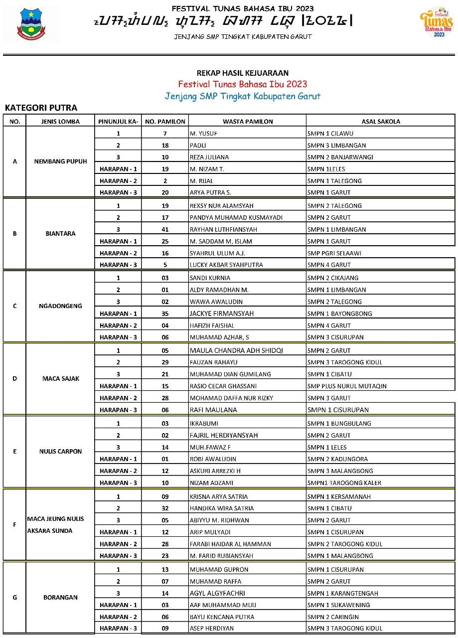 Dari final tersebut,dewan juri yang dipimpin Ida Rosida, S.Sen (Ketua Yayasan Cangkurileung Mang Koko), bersama G.J. Sentra Pramudita, S.Pd., (SMAN 1 Cikancung Kabupaten Bandung), dan Sony Riza Widyagiri, S.Sen., M.Sen (SMKN 10 Bandung) telah memutuskan sebanyak 14 siswa putra dan putri akan mewakili Kabupaten Garut dalam ajang yang sama di tingkat Provinsi Jawa Barat yang akan dilaksanakan pada tanggal 15-16 November 2023 di Hotel Sutan Raja, Jl. Raya Soreang No. 10 Km. 17, Soreang, Bandung.