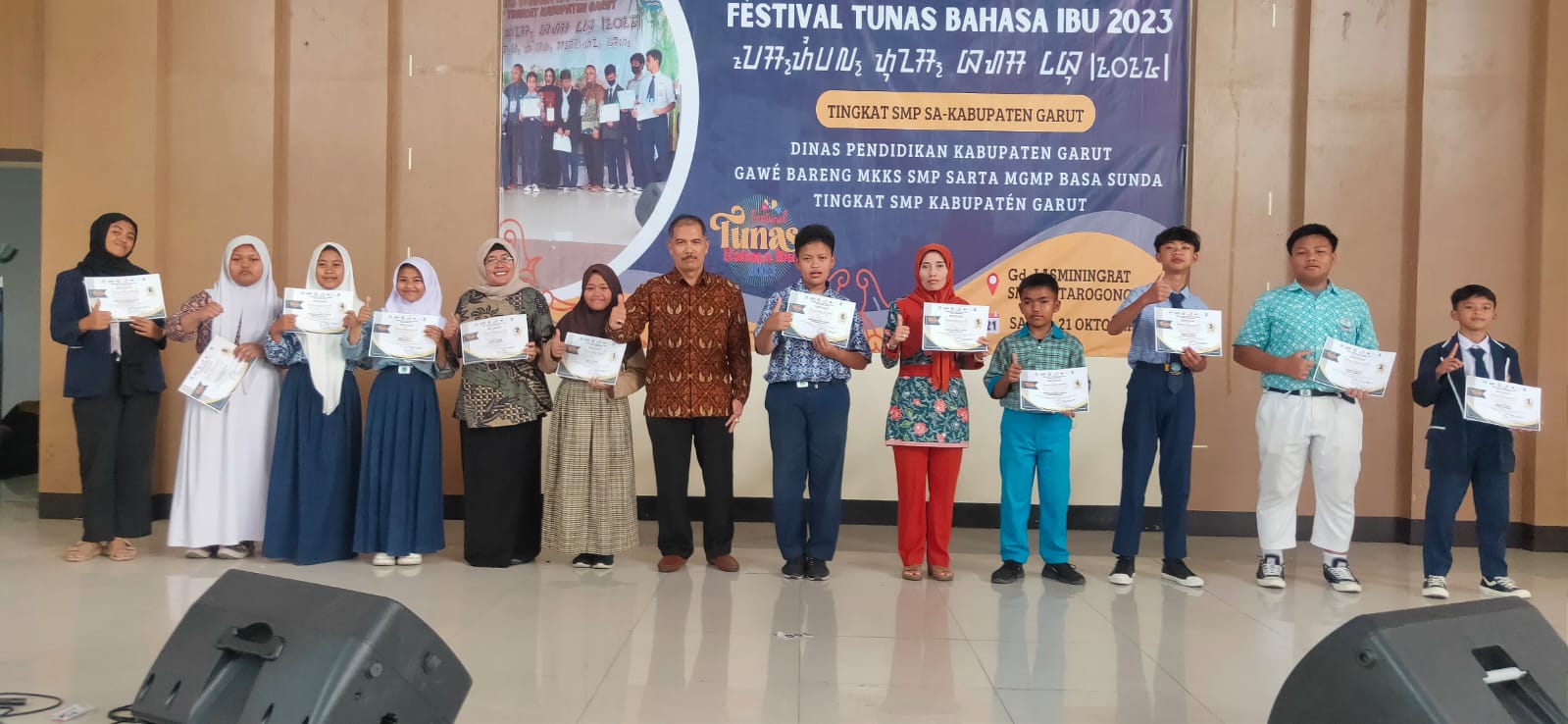 teraskandaga.com – Festival Tunas Bahasa Ibu (FTBI) jenjang SMP tingkat Kabupaten Garut tahun 2023 diakhiri dengan final Nembang Pupuh sebanyak 20 putra dan 21 putri yang dilaksanakan di Gedung Lasminingrat, Jl. Jend. A. Yani No. 32A, Kelurahan Pakuwon, Kecamatan Garut Kota, Kabupaten Garut, Jawa Barat pada Minggu (22/10/2023).