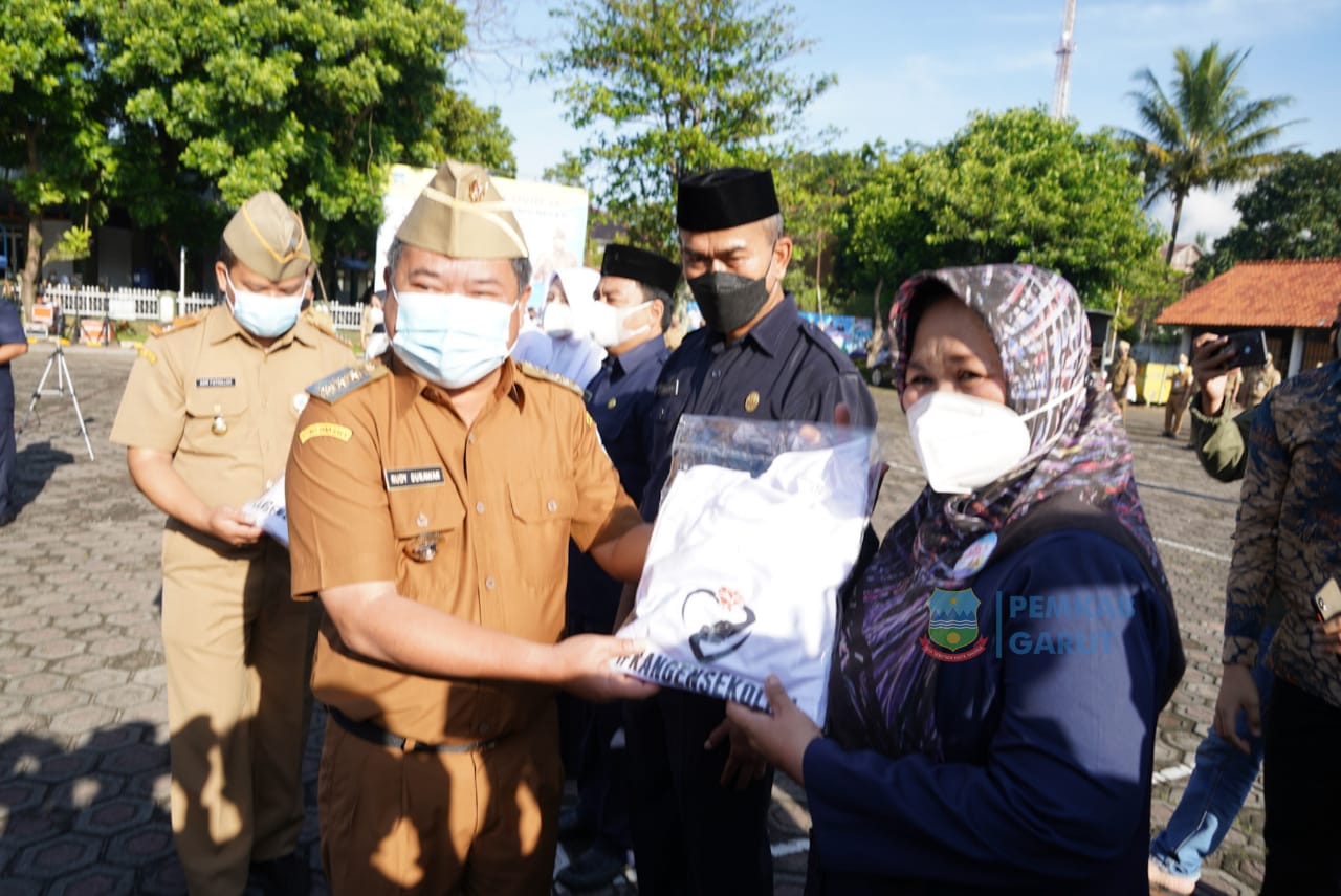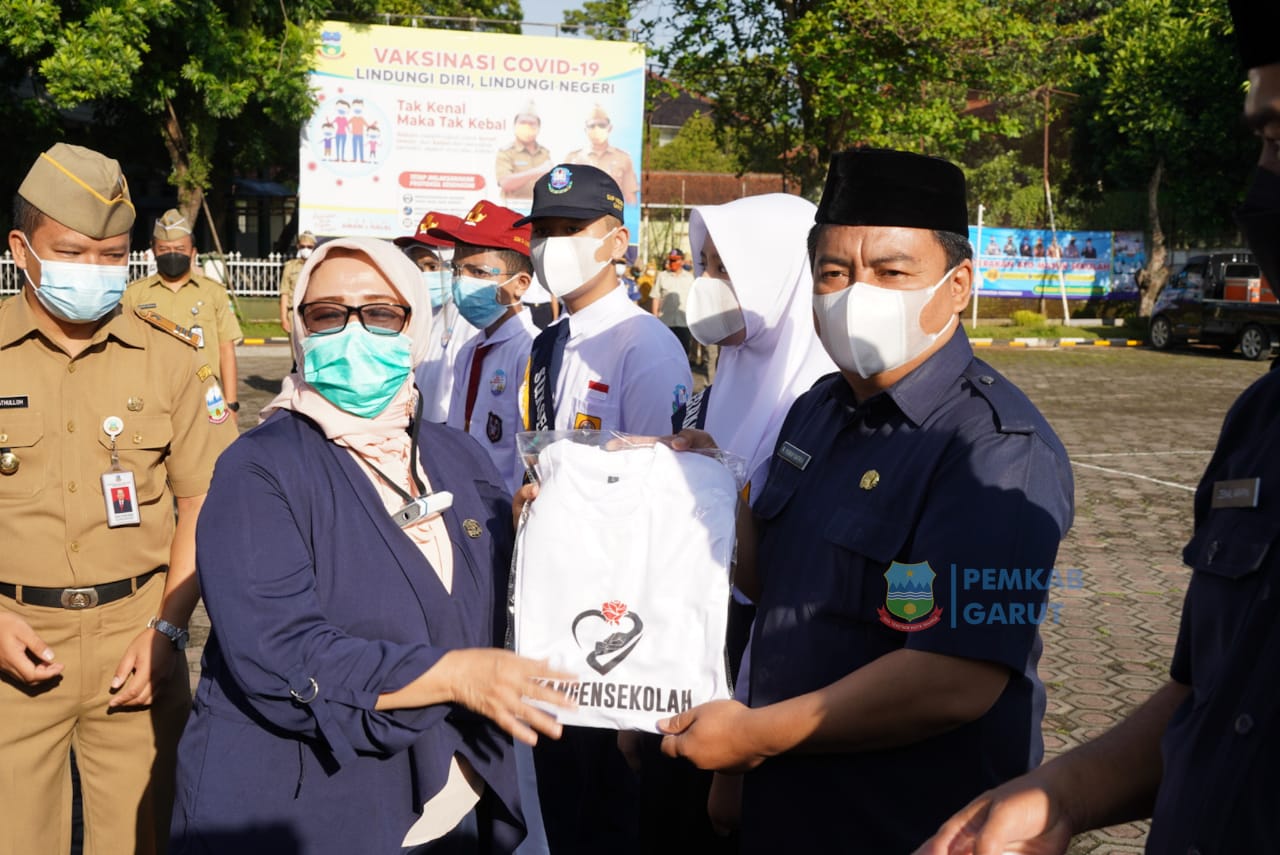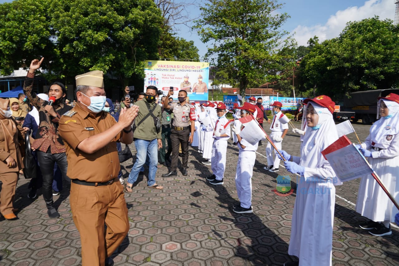 Apel pagi istimewa dan terbatas ini, dihadiri Ketua DPRD, Kejari, Kapolres, Dandim 0611/Garut, Ketua PN, Sekda beserta kepala SKPD, Kepala Kantor Kemenag, kepala Bank bjb Garut, Ketua Baznas, Ketua tim penggerak PKK, Duta Pendidikan Provinsi Jawa Barat, Korwil pendidikan, kepala SMP, kepala SD, kepala TK/PAUD dan 50 peserta didik terdiri dari 20 anak SMP, 20 SD, serta 10 anak TK, juga perwakilan SMA, SMK, Uninga, dan diikuti secara virtual oleh para guru se-Kabupaten Garut dan lainnya di tempat masing-masing.