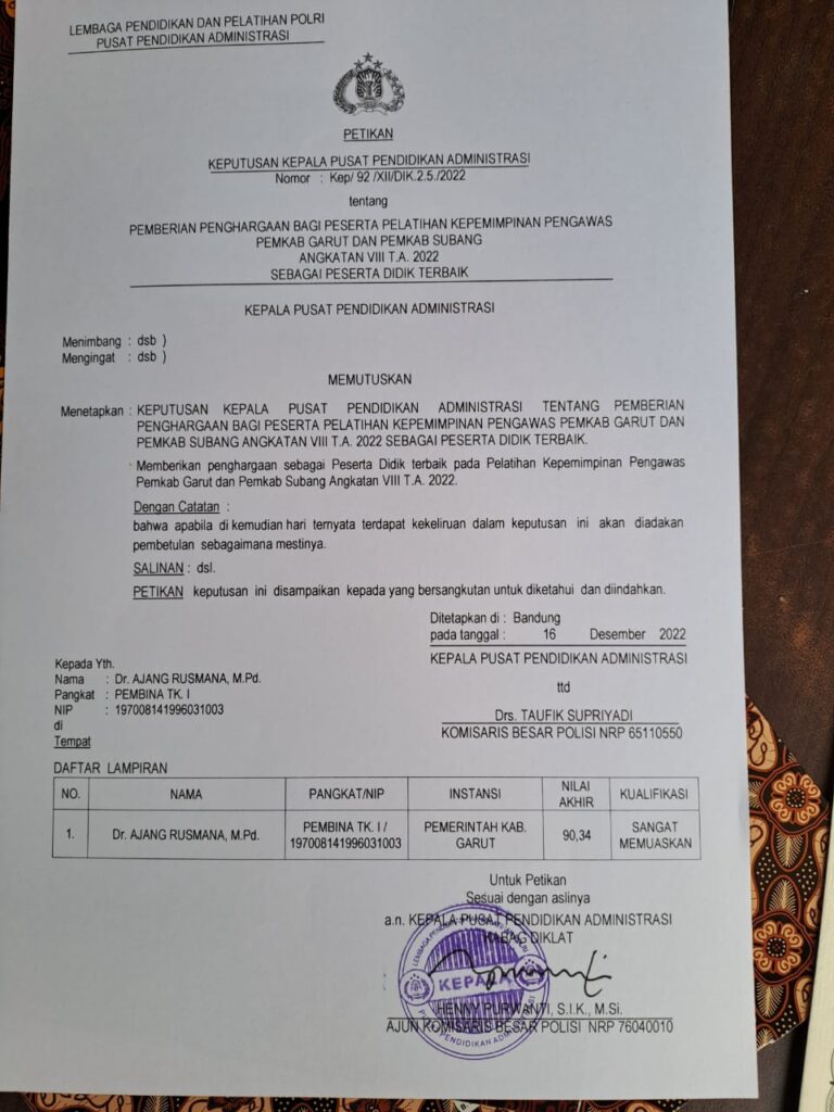Termasuk Dr. Ajang Rusmana, M.Pd., sebagai Kasi Kurikulum SMP Disdik Garut yang baru dilantik 31 September 2022, harus segera menjalani pelatihan ini. Beliau ditugaskan mengikuti pelatihan berdasarkan Surat Tugas dari Kepala BKD Garut selama 3 bulan, yaitu mulai 12 Oktober sampai dengan 16 Desember 2022 di Pusdikmin POLRI Bandung.