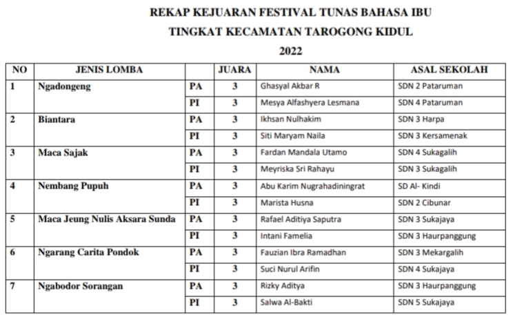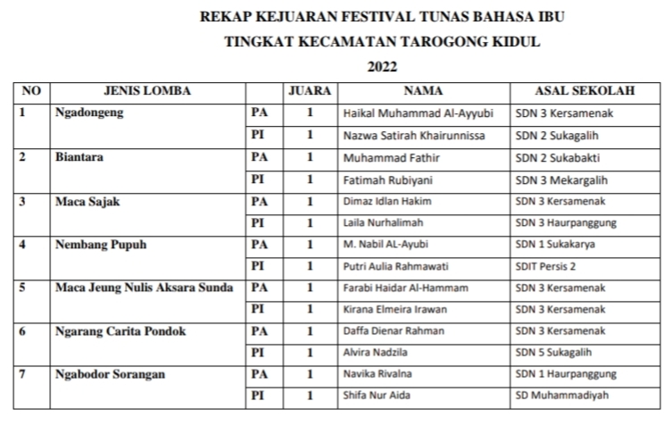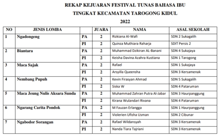 Berikut rekapan juara FTBI tingkat Korwil Bidang Pendidikan Kecamatan Tarogong Kidul :