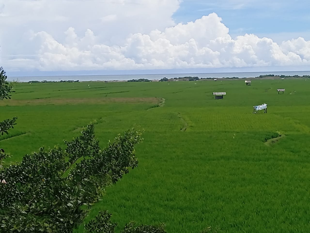 Di bagian depan, terbentang hamparan sawah menghijau dengan beberapa saung petani sederhana yang mencerminkan keselarasan hidup masyarakat pedesaan. Sementara di kejauhan, birunya Laut Selatan tampak memeluk daratan, di bawah langit luas berhiaskan awan putih yang megah.