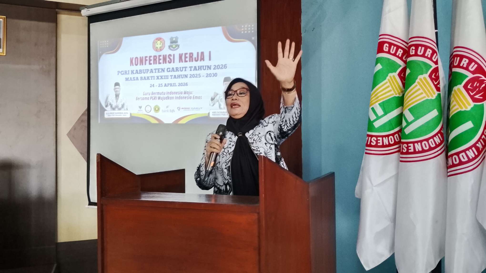 Garut, Sabtu (25/4/2026) — Konferensi Kerja Kabupaten (Konkerkab) I PGRI Kabupaten Garut Masa Bakti 2025–2030 resmi ditutup oleh Ketua PGRI Kabupaten Garut, Dr. H. Encep Suherman, di Ruang Paripurna PGRI Kabupaten Garut, Jalan Pasundan No. 41, Kelurahan Kota Kulon, Kecamatan Garut Kota.