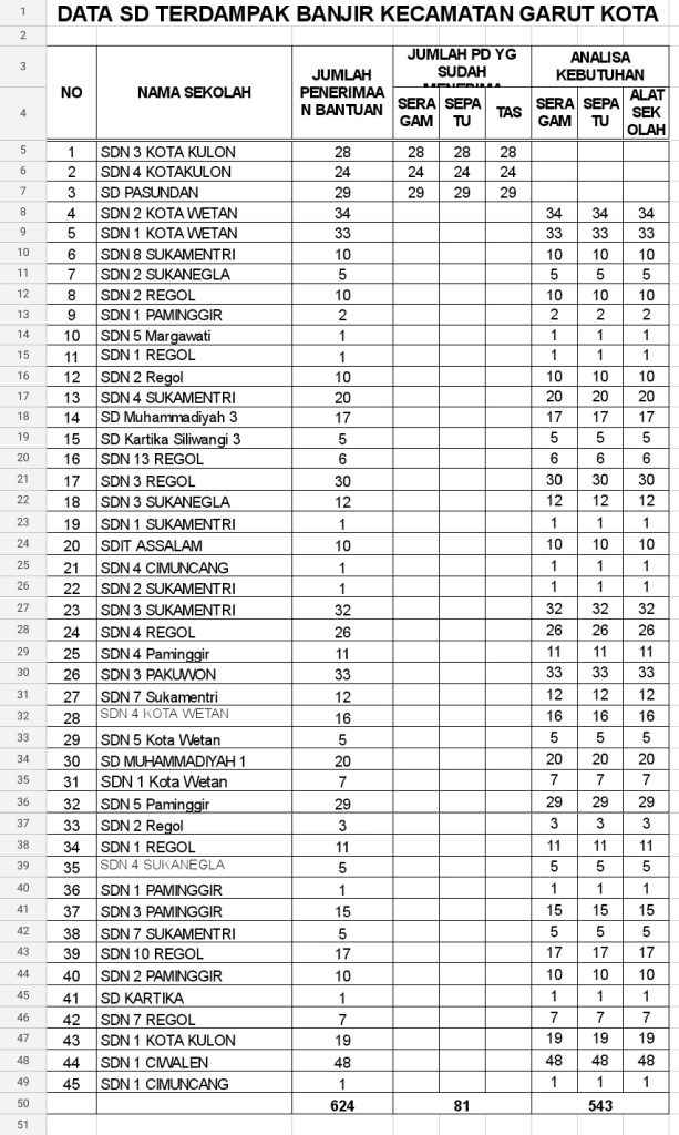 Misalnya di lingkungan Korwil Bidang Pendidikan Kecamatan Garut Kota, data yang terhimpun sementara sebanyak 700 peserta didik terdampak bencana banjir dan longsor akan diberikan bantuan seragam sekolah.