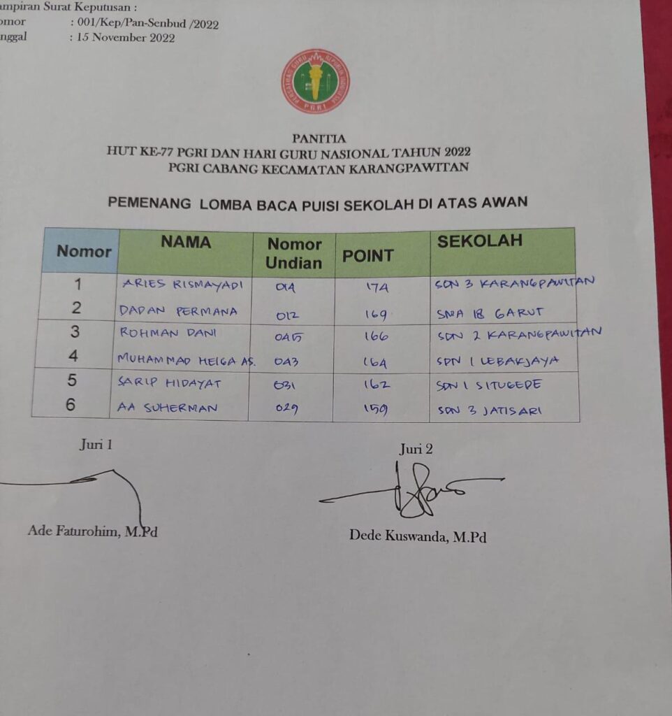 Lomba Puisi antar Guru Hiasi HUT PGRI ke-77 Cabang Karangpawitan
