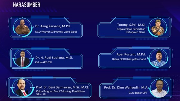 Webinar ini menghadirkan para pakar yang berpengalaman, diantaranya Prof. Dr. Deni Darmawan, S.Pd., M.Si., M.CE (Ketua Program Studi Teknologi Pendidikan, SPs IPI), Prof. Dr. Dinn Wahyudin, M.A. (Guru Besar UPI), Dr. H. Rudi Susilana, M.Si. (Ketua APS TPI), Drs. Aang Karyana, M.Pd. (KCD Wilayah XI Prov. Jawa Barat), Totong, S.Pd., M.Si. (Kepala Dinas Pendidikan Kab. Garut), dan Apar Rustam, M.Pd. (Ketua SEGI Kab. Garut).