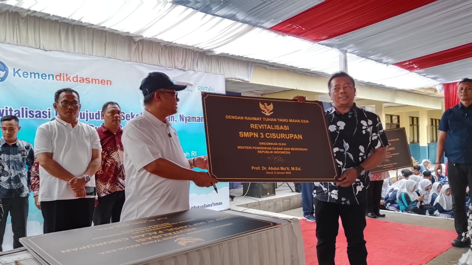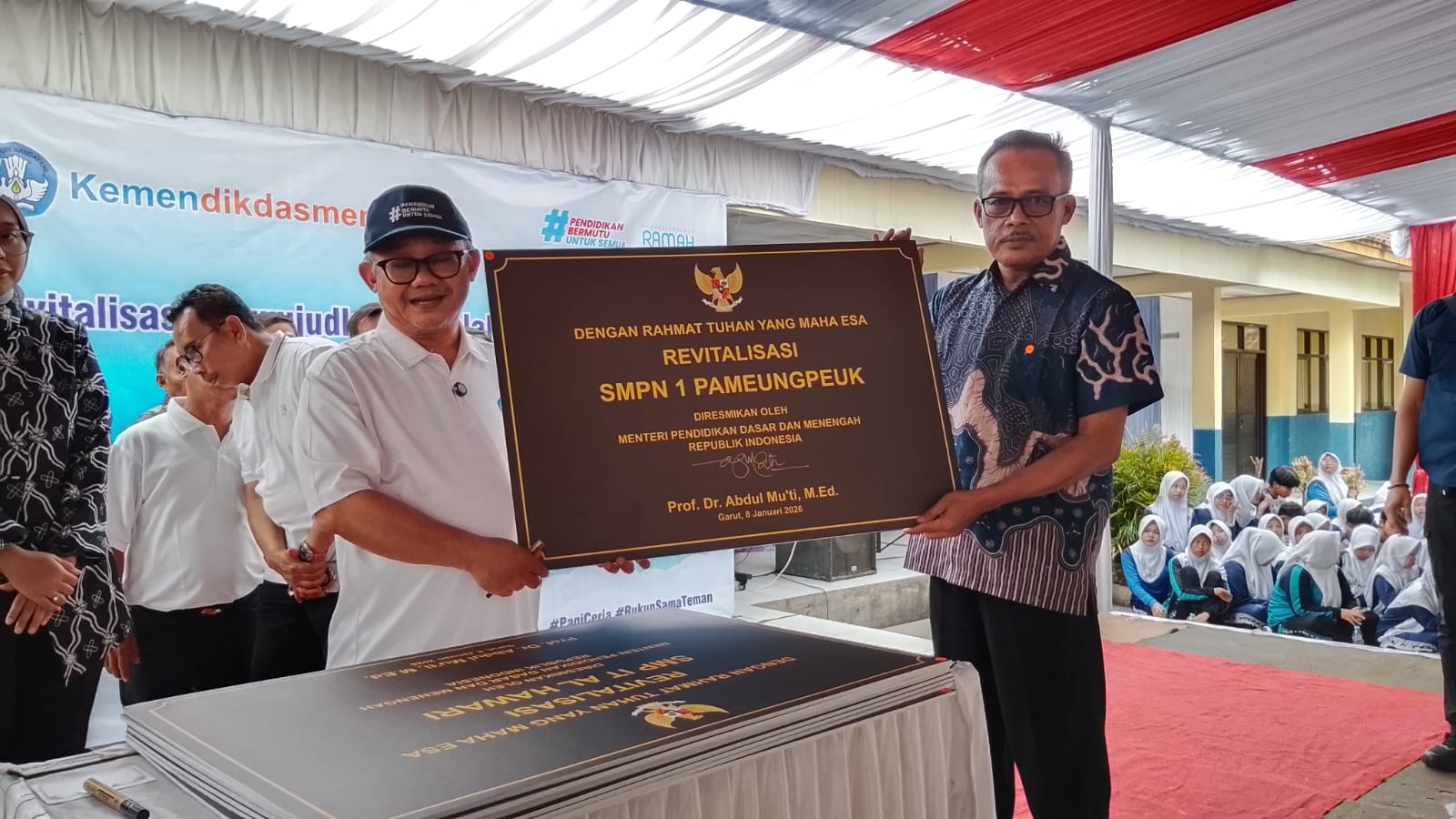 GARUT — Sebanyak 31 program revitalisasi sekolah jenjang Sekolah Menengah Pertama (SMP) di Kabupaten Garut mendapat respons langsung dari Menteri Pendidikan Dasar dan Menengah (Mendikdasmen) Republik Indonesia, Prof. Dr. H. Abdul Mu’ti, M.Ed. Peresmian revitalisasi tersebut dipusatkan di SMP Negeri 1 Tarogong Kaler yang berlokasi di Jalan Raya Samarang No. 52, Desa Rancabango, Kecamatan Tarogong Kaler, Kamis (8/1/2026).