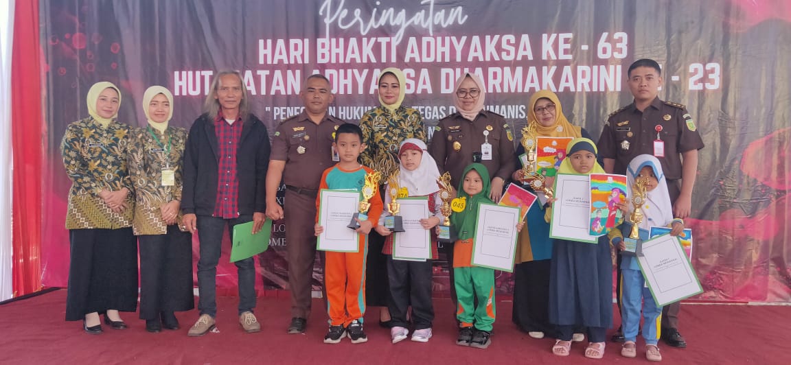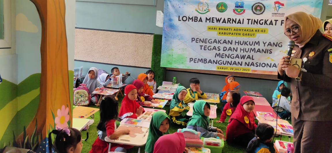 teraskandaga.com – Anak-anak PAUD Negeri/Swasta, dan siswa SD, SMP Negeri/Swasta terpilih meriahkan peringatan Hari Bhakti Adhyaksa ke-63 dan HUT XXIII Ikatan Adhyaksa Dharmakarini Tahun 2023, mereka mengikuti lomba mewarnai, yel-yel anti korupsi, dan menyanyi solo wajib nasional yaitu Pelajar Pancasila serta lagu pilihan Indonesia Jaya dan Rumah Kita di lingkungan Kantor Kejaksaan Negeri Garut, Jl. Merdeka No. 222, Haurpanggung, Kecamatan Tarogong Kidul, Kabupaten Garut, Provinsi Jawa Barat, Kamis (20/7/2023).