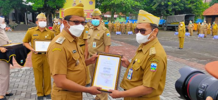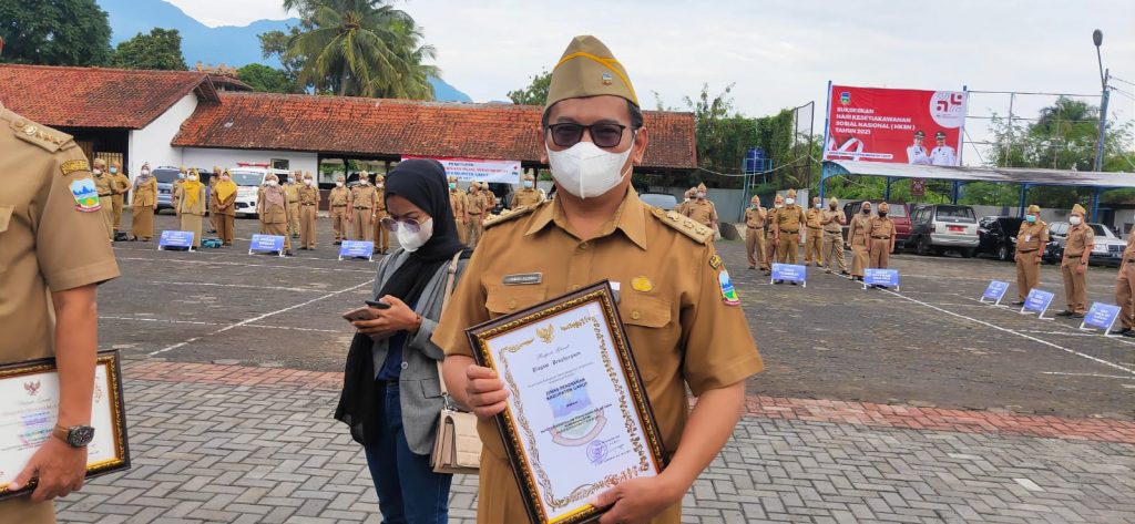 Penghargaan diserahkan Wakil Bupati Garut, dr. H. Helmi Budiman pada apel gabungan terbatas di Lapangan Sekretariat Daerah (Setda) Garut, Kecamatan Tarogong Kidul, Kabupaten Garut, Senin (20/12/2021).