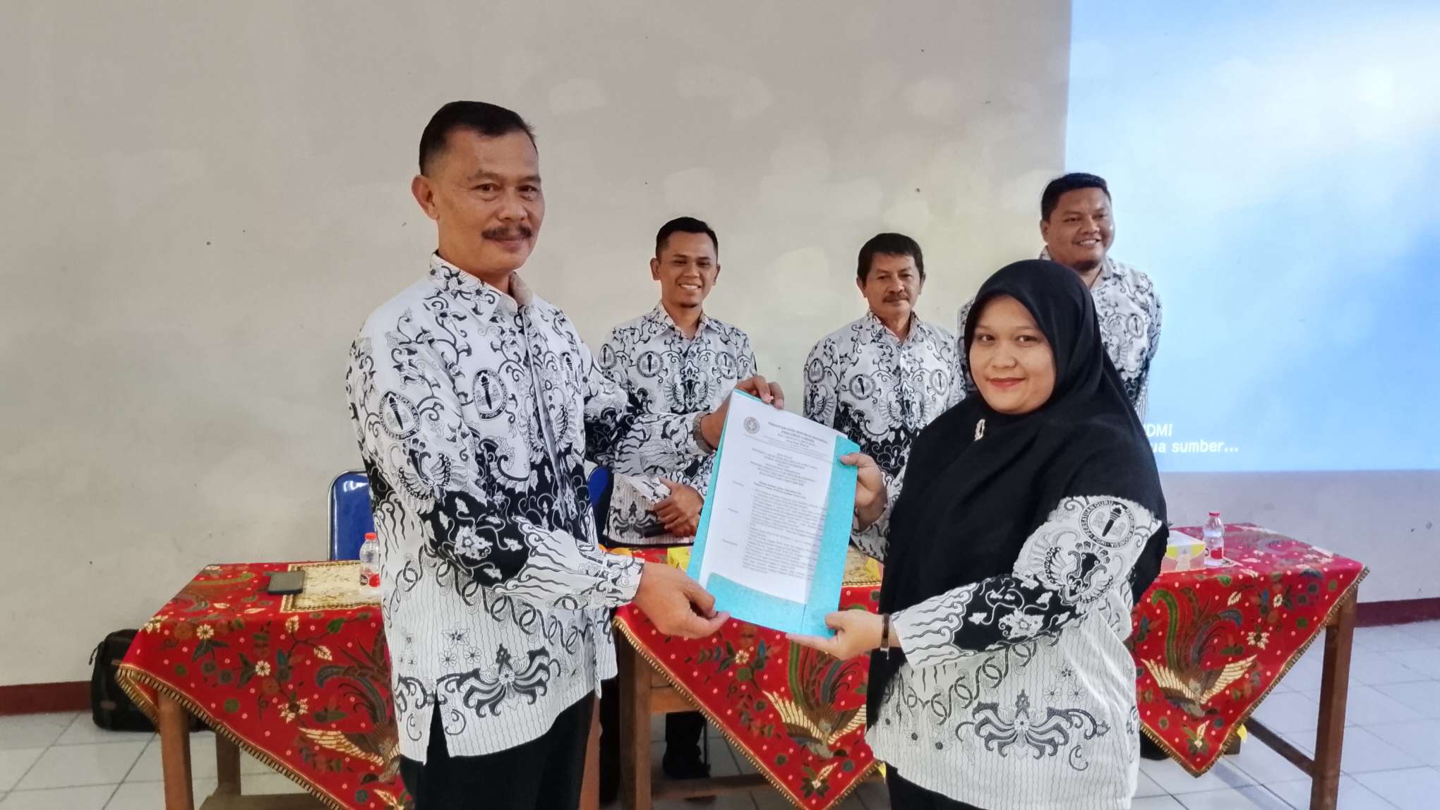 Wakil Ketua II PGRI Cabang Garut Kota, Sudrajat Cahya Gumilar, S.Pd., M.Pd , menyerahkan SK kepengurusan pada Ketua PGRI Ranting 5, Ai Rodiah, S.Pd.