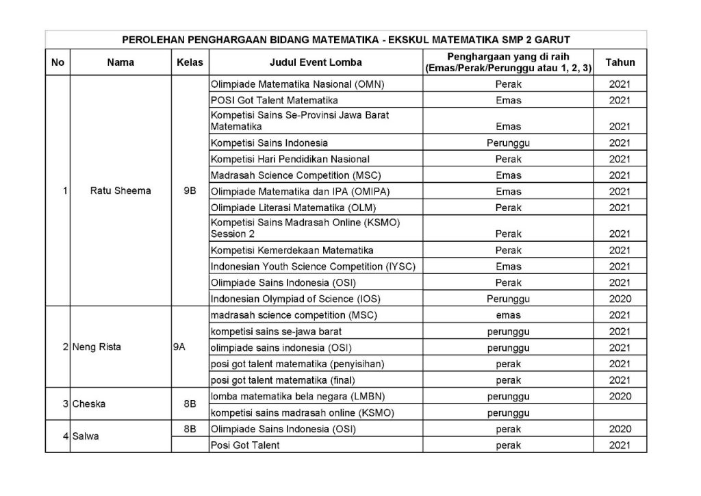 Peserta didik yang menjadi juara Festival Tunas Bahasa Ibu jenjang SMP Negeri/Swasta se-Kabupaten Garut adalah :