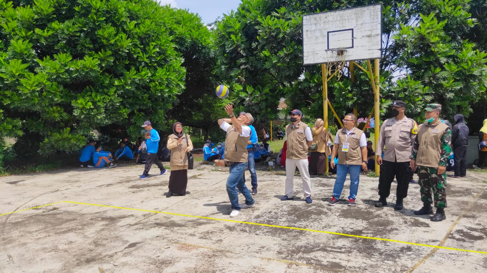 Ketua PGRI Cabang Garut Kota, Rahmat, S.Pd., melakukan servis bola voli sebagai tanda dimulainya rangkaian kegiatan HUT PGRI ke-77 dan HGN tahun 2022.
