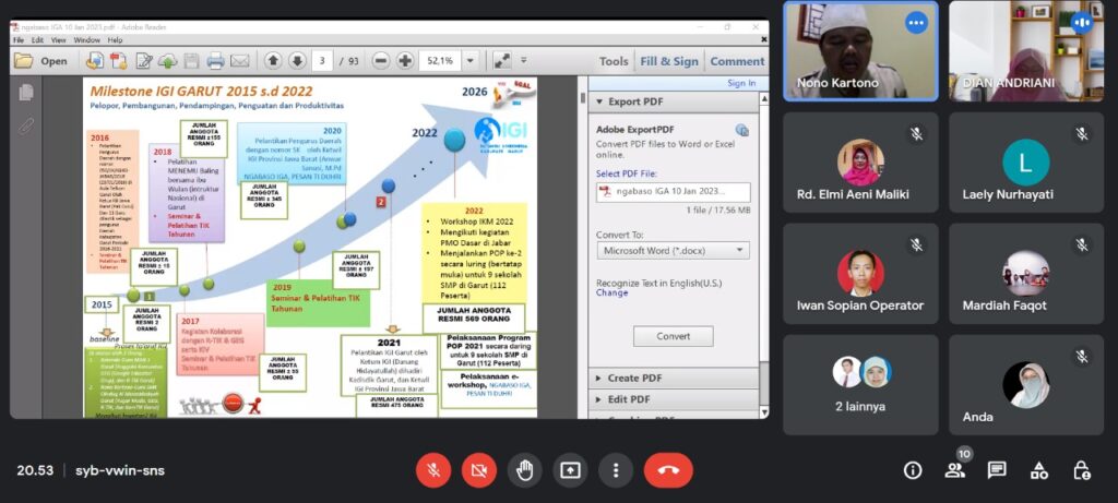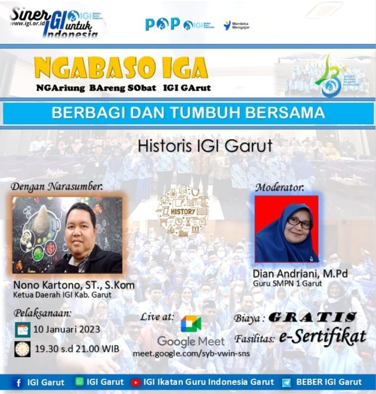PENGURUS Daerah Ikatan Guru Indonesia (IGI) Kab. Garut kembali melaksanakan agenda peningkatan mutu pendidikan bagi guru di Indonesia, Selasa malam (10/01/2023) dengan menggelar kegiatan NGABASO IGA (NGAriung BAreng SObat IGI GArut) bertajuk “Historis Perjalanan IGI Garut dari awal terbentuk hingga sekarang” secara daring.