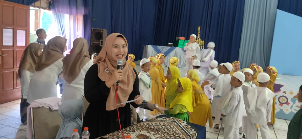 Ulfah Nisa Mujahidah. S.Pd., memandu acara RA Al-Bayyinah wisuda ke-32, kenaikan kelas dan pentas kreasi seni, Selasa (20/6/2023).