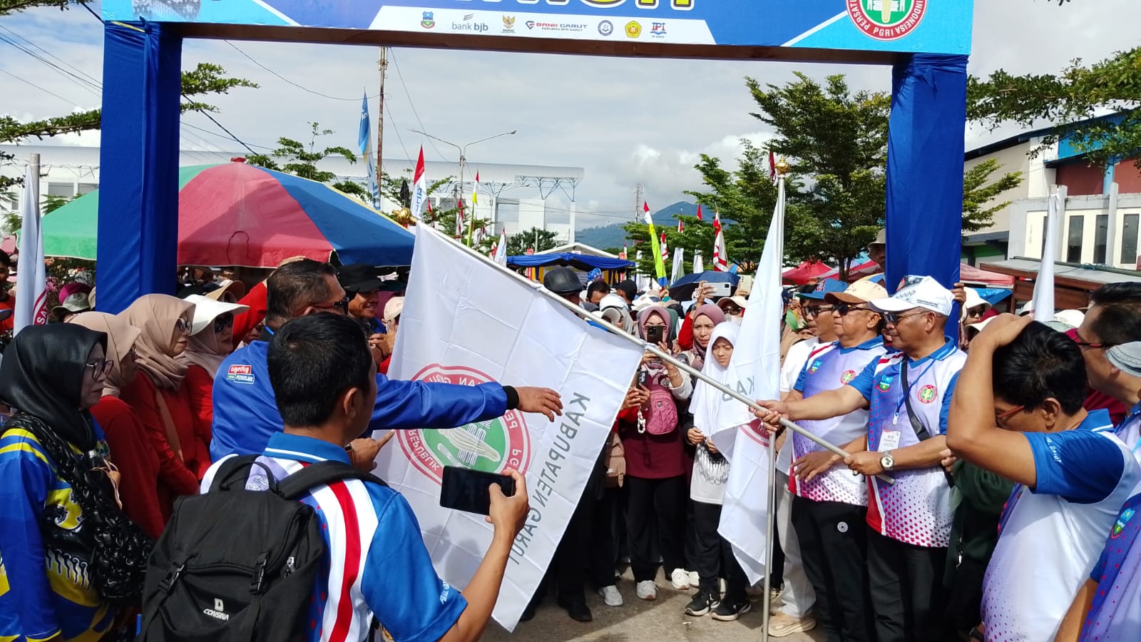 Jalan sehat dibuka secara resmi oleh Bupati Garut, Dr. Ir. H. Abdusy Syakur Amin, M.Eng., IPU, yang didampingi Ketua PGRI Kabupaten Garut, Dr. H. Encep Suherman, M.Pd., dengan pengibaran bendera start.