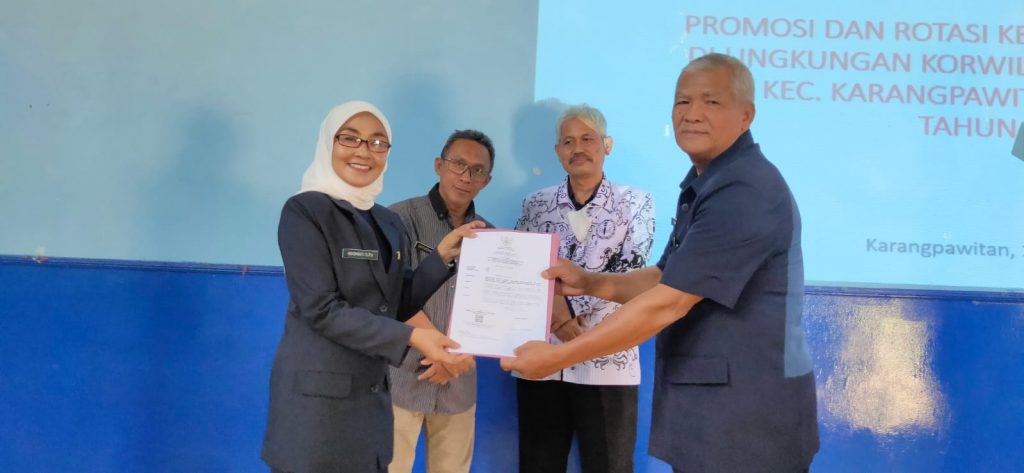 Penandatanganan dilakukan dihadapan seluruh kepala sekolah dan unsur Forkopimcam Karangpawitan, dengan saksi Camat, Korwil, Korwas, dan Ketua PGRI Cabang Karangpawitan, yang dilanjutkan penyerahan SK secara simbolis untuk promosi oleh Korwil sedangkan SK rotasi oleh Camat Karangpawitan.