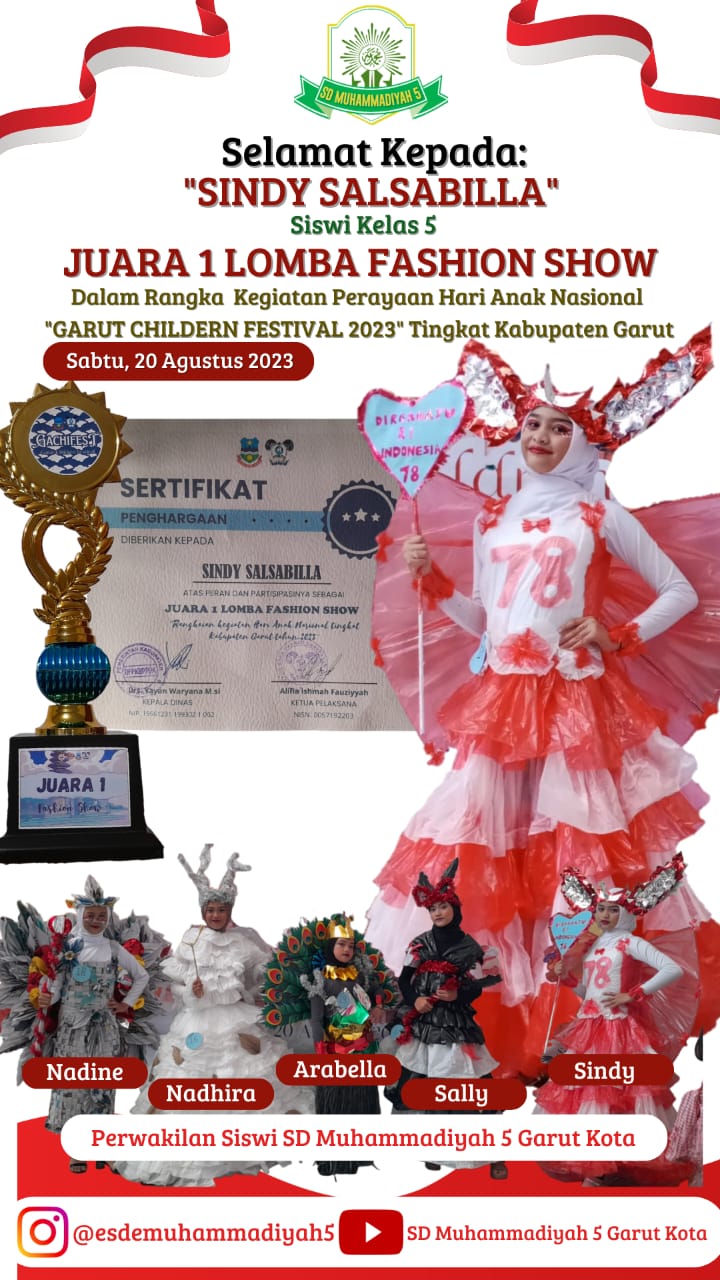 teraskandaga.com – Sindy Salsabila, siswi kelas 5, SD Muhammaddiyah 5 meraih juara Juara 1 Lomba Fashion Show (berbahan daur ulang) dalam Perayaan Hari Anak Nasional (HAN) “Garut Children Festival (GACHIFEST) tingkat Kabupaten Garut Tahun 2023 yang dilaksanakan di Gedung Art Center, Kecamatan Tarogong Kidul, Minggu (20/8/2023), dengan tema “Anak Terlindungi, Indonesia Maju”.