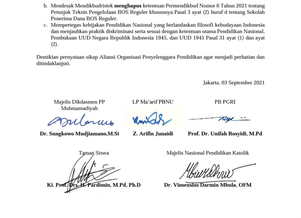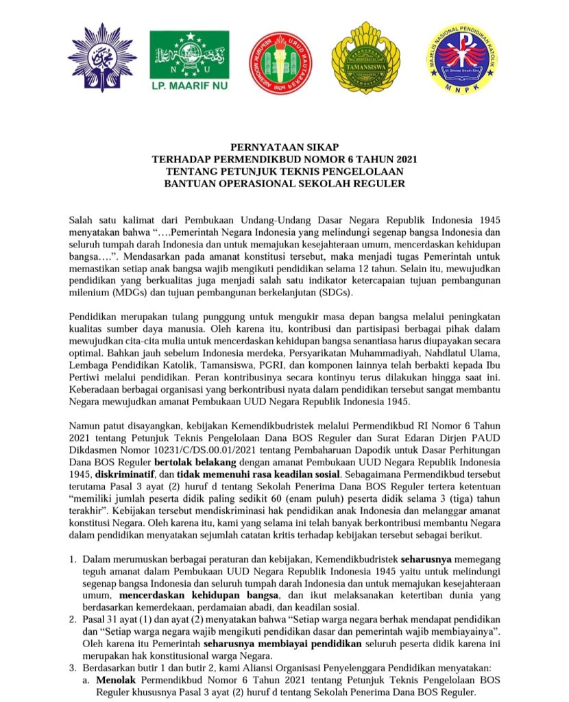teraskandaga.com – Terbitnya Permendikbud Nomor 6/2021 yang akan memberikan alokasi BOS sesuai jumlah siswa, dipandang oleh organisasi penyelenggara pendidikan sebagai ancaman terhadap punahnya hak dasar pendidikan anak.