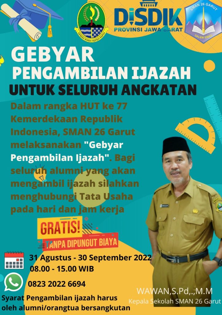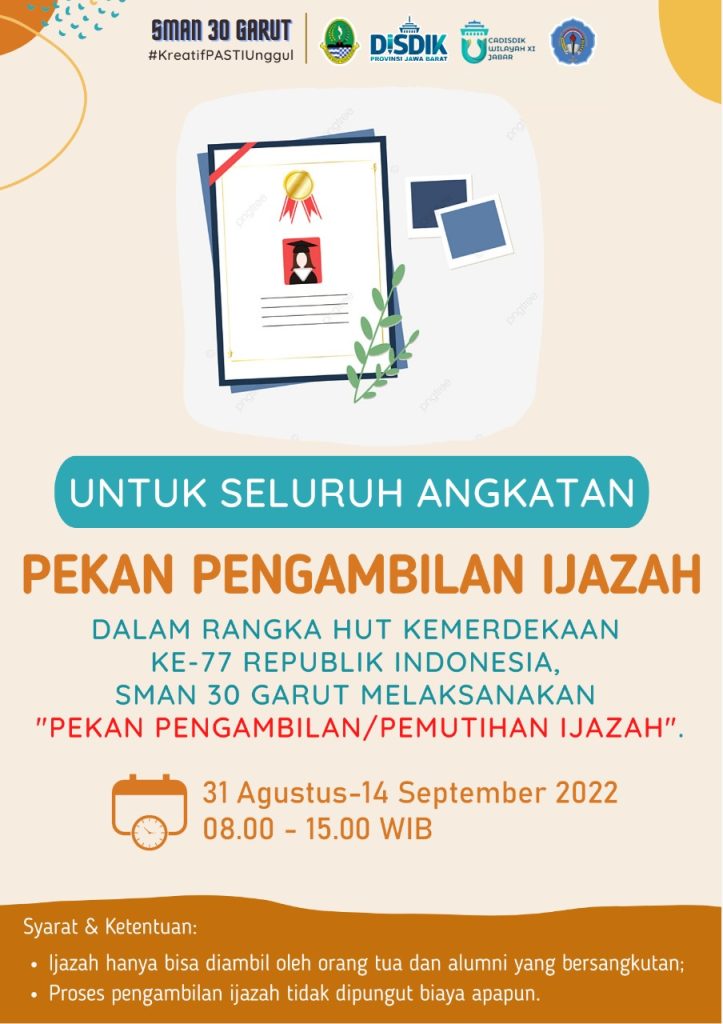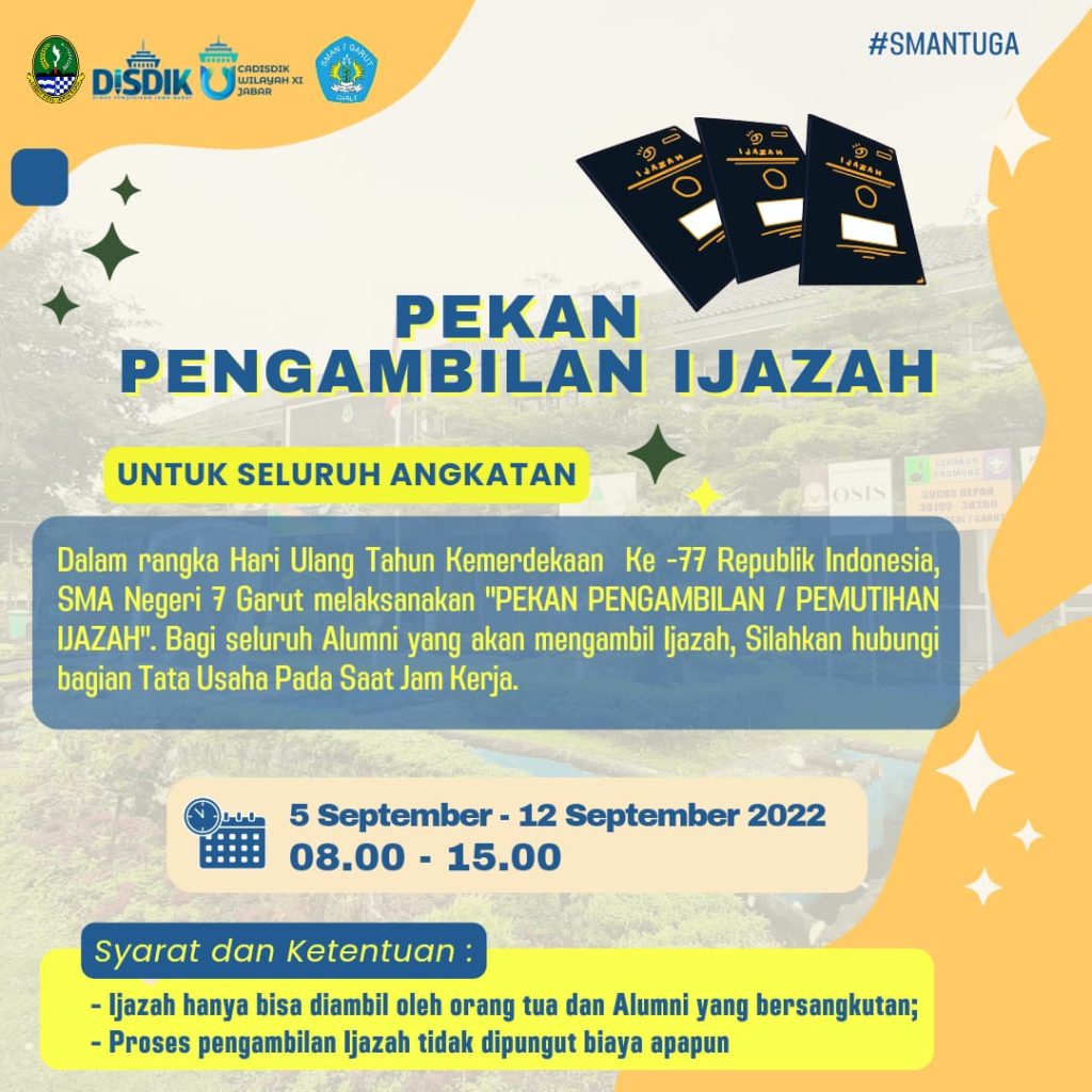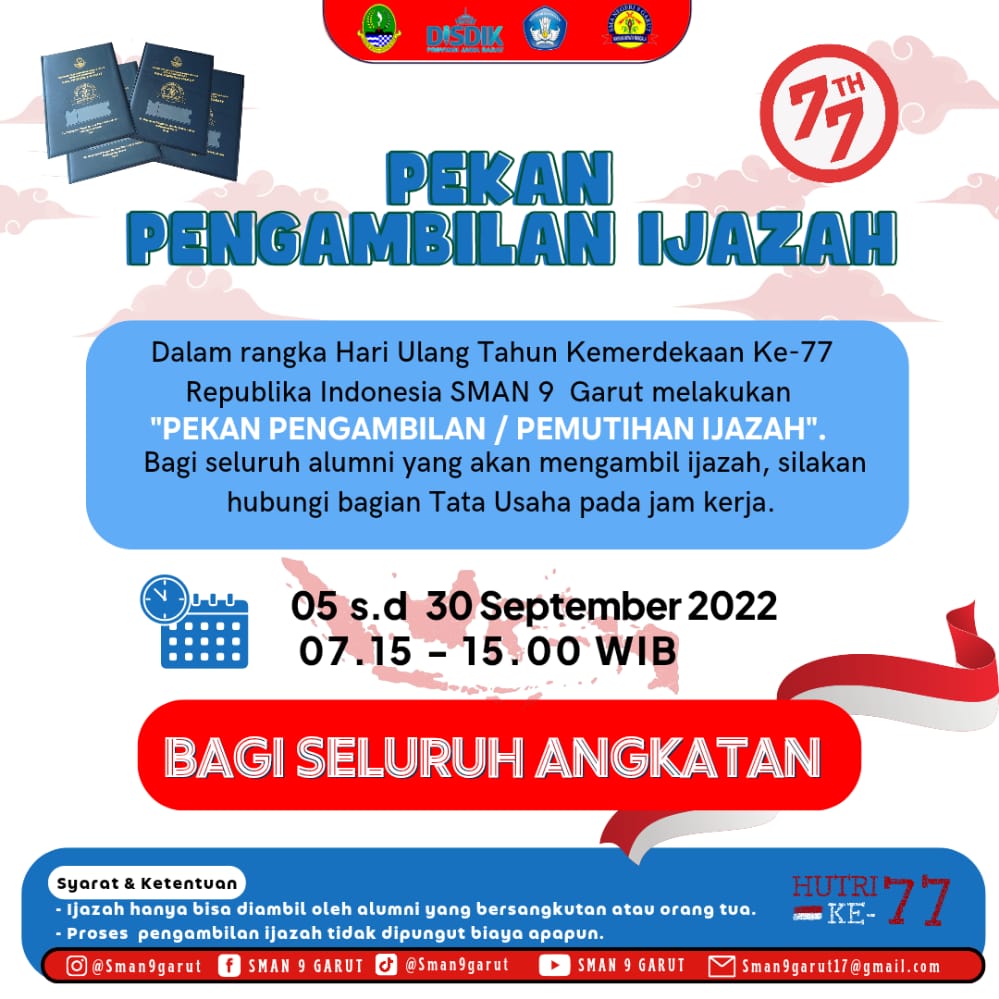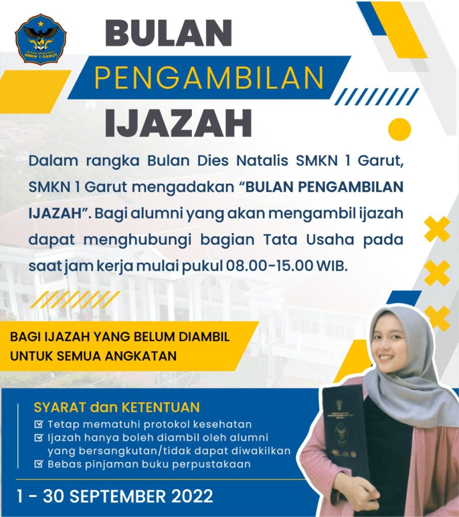 Berdasarkan informasi, dalam rangka dies natalis SMKN 1 Garut mengadakan Bulan Pengambilan Ijazah dimulai tanggal 1-30 September 2022 pada saat jam kerja mulai pukul 08.00-15.00 WIB