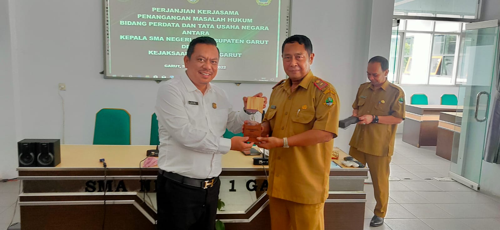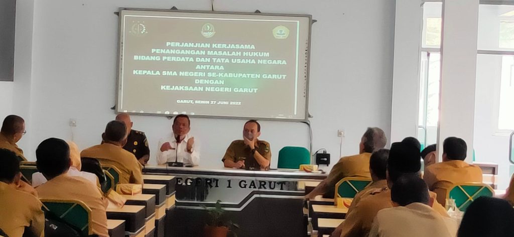TARKID, (teraskandaga.com).- Untuk memberikan pemahaman tentang hukum sekaligus mengayomi seluruh warga sekolah, SMA Negeri se-Kabupaten Garut melakukan perjanjian pendahuluan atau Memorandum of Understanding (MoU) dengan Kejaksaan Negeri Garut di Ruang Rapat SMAN 1 Garut, Jl. Merdeka No. 91, Jayaraga, Kecamatan Tarogong Kidul, Senin (27/6/2022).