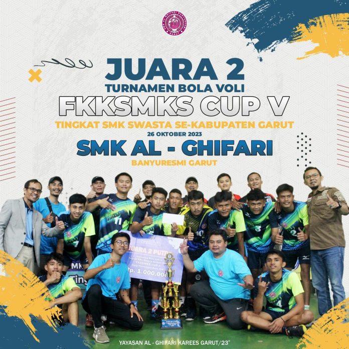 teraskandaga.com – Tim Bola Volly Putra SMK Al-Ghifari Garut keluar sebagai juara kedua Turnamen Bola Volly FKKSMKS Cup V Tahun 2023 yang diselenggarakan di SOR R.A.A. Adiwidjaja Ciateul, Jl.Proklamasi No. 27, Jayaraga, Kecamatan Tarogong Kidul, Kabupaten Garut, Provinsi Jawa Barat pada Kamis (26/10/2022) baru lalu.