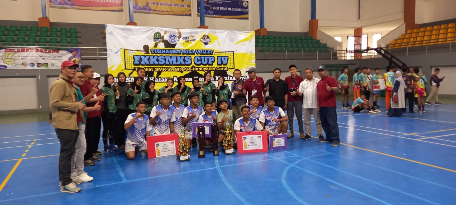 KARANGPAWITAN, (teraskandaga.com).- Tim bola voli putra SMK IT Al-Muhajirin berhasil meraih trophy juara 1 setelah menumbangkan tim SMK Nurul Muttagien dengan skor 3-2 pada turnamen bola voli antar SMK Swasta se-Kabupaten Garut dalam kejuaraan FKKSMKS Cup ke-IV yang digelar SOR Ciateul.