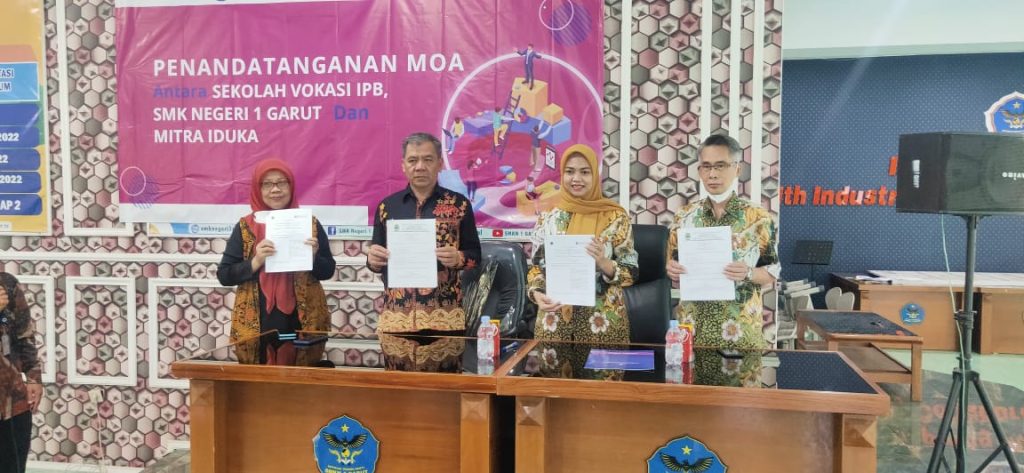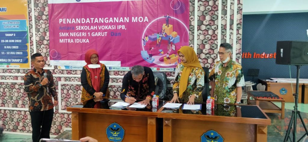 TARKID, (teraskandaga.com).- SMKN 1 Garut melakukan penandatanganan MOA dengan Sekolah Vokasi IPB dan Mitra IDUKA di Sasana Wibawa Mukti, Jum’at (22/7/2022).
