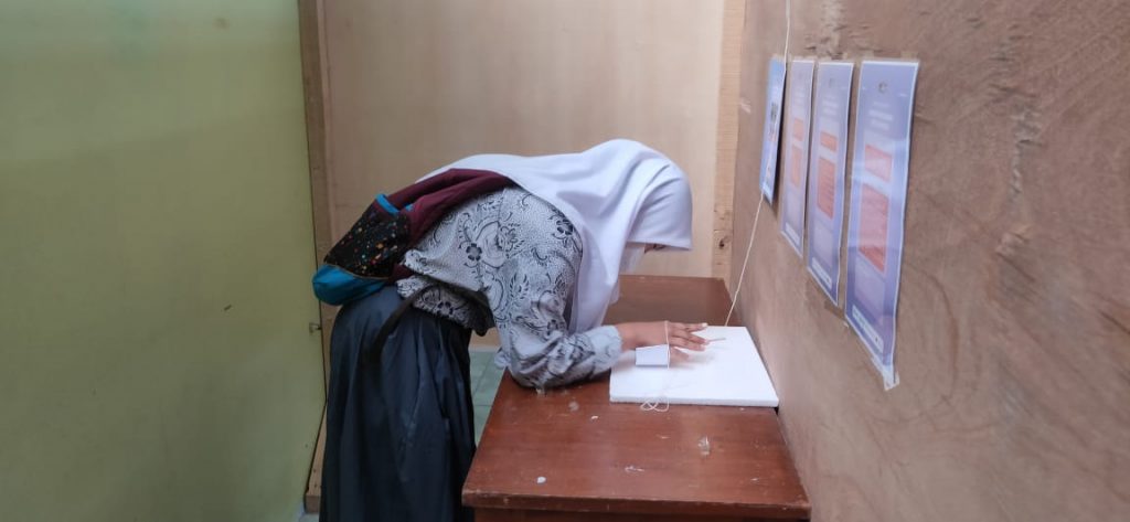 Terpantau dalam pesta demokrasi ini, tersedia lima bilik suara dan tempat pendaftaran dan para pemilih sudah diatur tiap kelas dengan sistem sesi.