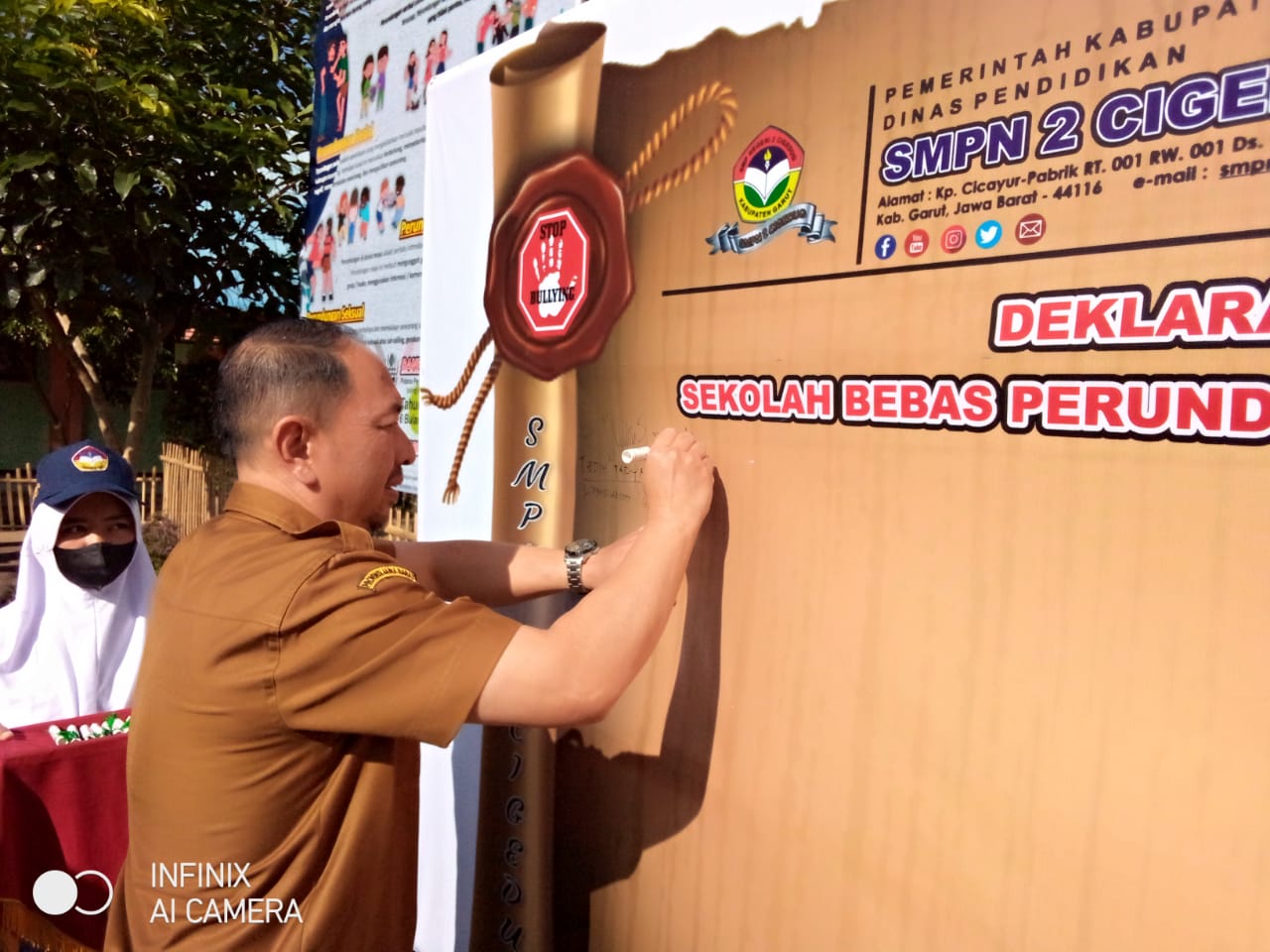 Deklarasi Sekolah Bebas Perundungan di SMPN 2 Cigedug, ditandai dengan penandatanganan fakta deklarasi oleh Kapol sub sektor Cigedug, kepala sekolah diikuti oleh seluruh guru dan peserta didik.