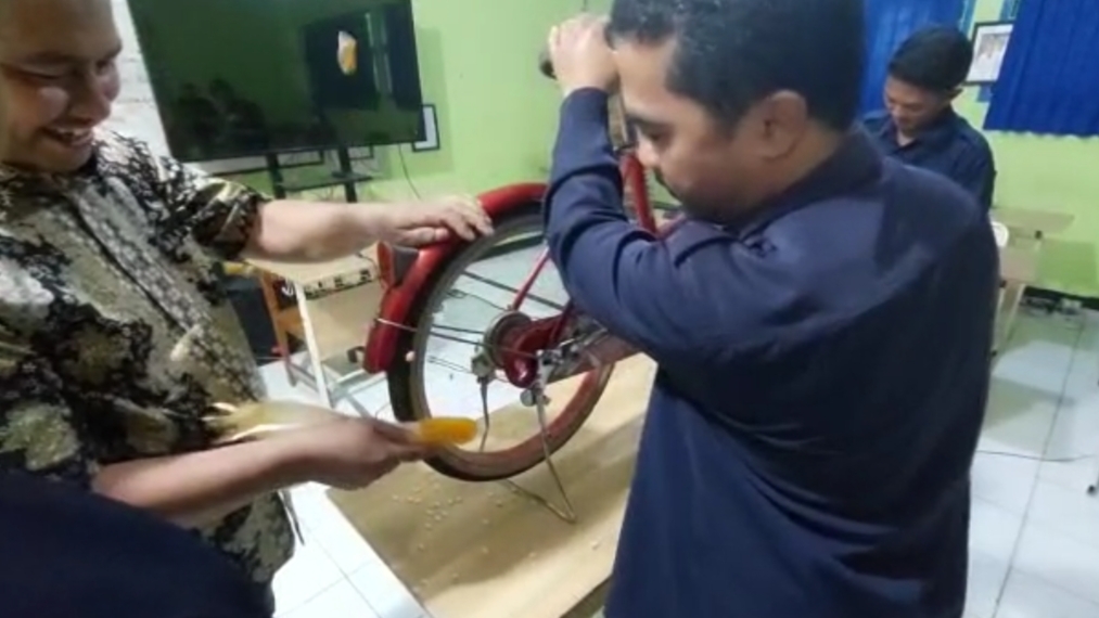 “Alhamdulillah, tiap kelompok muncul rekayasa-rekayasa luar biasa dalam bentuk miniatur, bahkan ada kelompok dengan menggukan batu battre. Dan dari semua itu, tepilih satu rekayasa yaitu sepeda yang bisa memutarkan roda bolak-balik dengan dua rodanya bisa memipil jagung masing masing sisi satu atau lebih,” terangnya.