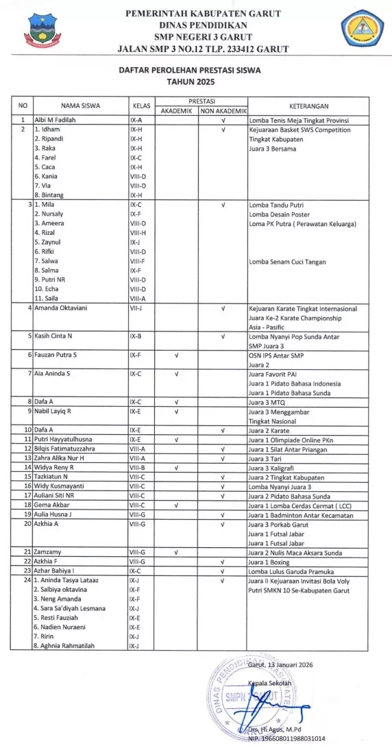 Agus WF menyampaikan bahwa sepanjang tahun 2025 SMPN 3 Garut berhasil meraih berbagai prestasi membanggakan di bidang akademik dan nonakademik. Prestasi tersebut meliputi kejuaraan akademik, olahraga, seni dan budaya, serta aktivitas ekstrakurikuler lainnya, baik di tingkat kecamatan, kabupaten, hingga provinsi.